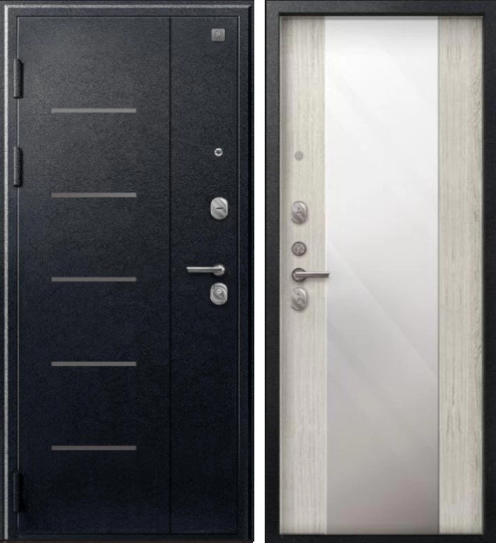 Надежная входная Дверь V-04 Черный муар - Полярный дуб Зеркало премиум класса по цене 42 863 руб. Большая толщина стали защитит от проникновения в ваш дом, квартиру или коттедж. Используется очень качественная фурнитура: замки, цилиндры, ручки, защелки. Покрытие и отделка двери изготовлено под внимательным контролем производителя. Дверь имеет долгий срок службы и гарантию.
